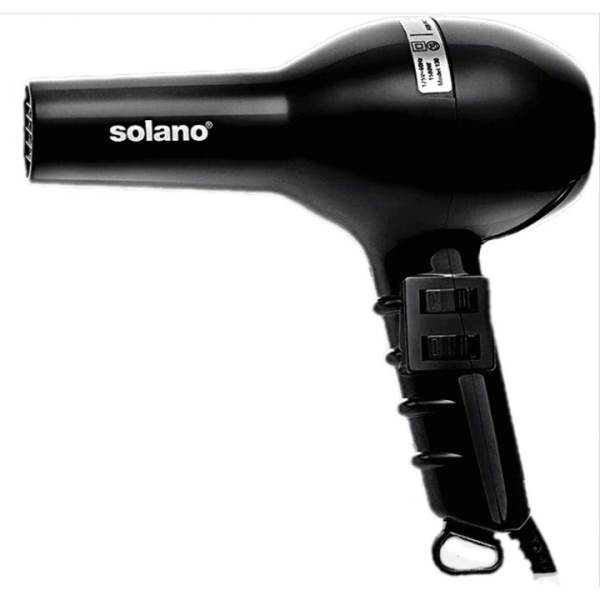 The Solano Original Professional Hair Dryer uses a ceramic heater as well as ceramic thermal grill to keep heat consistent, and tourmaline to boost the negative ions produced by a 1500 watt long lasting AC motor. Add a high gloss black finish that is durable and easy to clean and quiet operation from a powerful long-life motor. Features three temperature settings and two speed settings, extra-long cord with hang ring and a removable filter for easy cleaning. Includes narrow fiberglass concentrator.