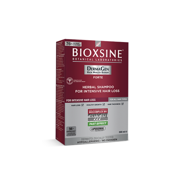 Bioxsine Dermagen Forte Shampoo was developed for people who suffer from severe to very severe hair loss. Bioxsine Forte Shampoo is based on the active herbal formula BioComplex B11 from specially combined phyto-extracts to effectively reduce hair loss and promote hair growth for thicker and stronger hair. Contains no paraben, phthalates or dyes. Actives that are effective in hair loss are powered by Liposome Technology. In clinical trials, among the the participants a noticeable 48% reduction in hair loss occurred just after one month.* Efficacy tests have proven that Bioxsine Forte Shampoo helps prevent hair loss when used continiously and regularly, promote hair growth and revitalises weak hair roots and provides resilince, volume, shine and vibrancy to hair. Based on dermatological tests : 100% decrease in hair loss, 93% stronger hair, 83% thicker hair fibers, were observed among the users. Safety tests have proven that Bioxsine Forte Shampoo dermatologically tested by Dermatest Laboratories and it has a ph values suitable for the scalp and skin. *University of Pavia randomized, placebo-controlled study of Bioxsine shampoo and serum for 6 months. How To Use Apply to wet hair with a massage, keep it for 1-2 minutes and rinse well.