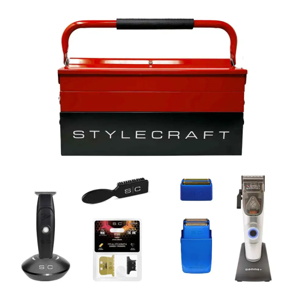 • Includes: GAMMA+ X-Ergo Clipper, S|C Hitter Trimmer, Gold Titanium X-Pro Wide fixed blade with The One moving blade set, S|C Wireless Prodigy Shaver with additional replacement slick foil head, S|C Fade Brush, Tool Box