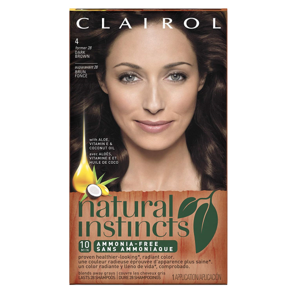 Clairol Natural Instincts Permanent Hair Color 4 Dark Brown. Natural instincts with a unique blend of aloe and coconut oil. An ammonia free formula that gives you healthier-looking, radiant color and blends away gray in 10 minutes. Color lasts up to 6 weeks. Blends away grays.