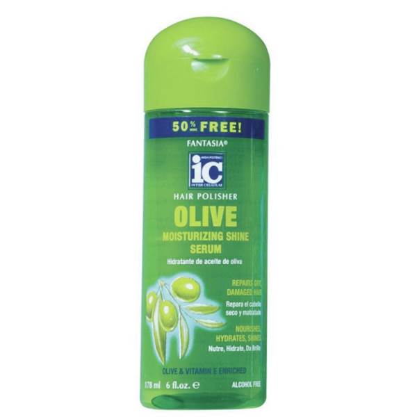 - Fantasia IC Hair Polisher Olive Moisturizing Shine Serum Feather lite formula does not weigh the hair down for easy styling