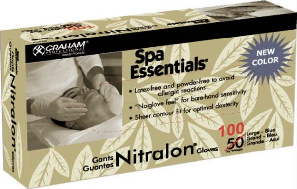 Wear Spa Essentials Blue Nitralon Nitrile Gloves when you need to protect your hands but want the sensitivity of bare hands. Designed for flexibility, finger dexterity and a contoured fit.