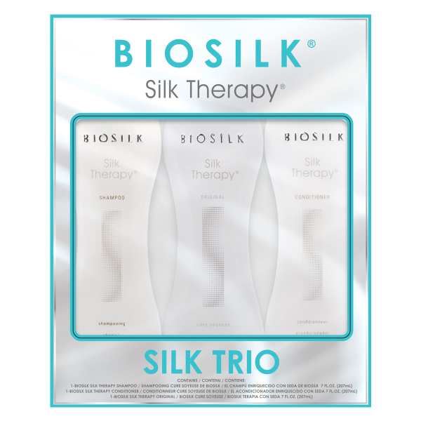 Biosilk Silk Therapy Trio is the Biosilk kit to give damaged hair the best possible wellness. Enriched by the benefits of silk, they leave the hair hydrated, soft and shiny. Biosilk Silk Therapy Trio is composed of shampoo, conditioner and Silk Therapy Original treatment