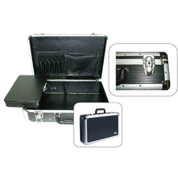Black metal barber case with five compartments.