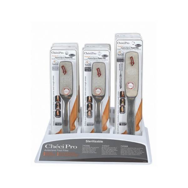 The key feature of our Checi Autoclave files is that they can be sterilized in an Autoclave. In addition, just like our other Checi Pro Series Foot Files, they have anatomically-friendly handles with a smooth and comfortable grip.Our 9 piece display has a sleek design that will display these carded files beautifully. The display includes 3 of the fine, medium and dual-sided foot files.