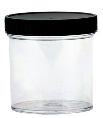 Clear plastic jar with black lid. Ideal for glitters and powders.