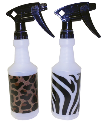 Natural HDPE bottle with black Zebra or brown & black Leopard graphic and black Model 220 trigger sprayer.