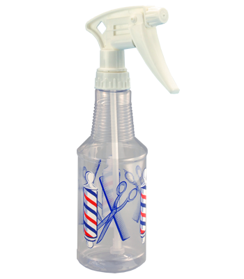 Clear bottle with nostalgic red, White, and blue barber pole, shears, and combs graphic