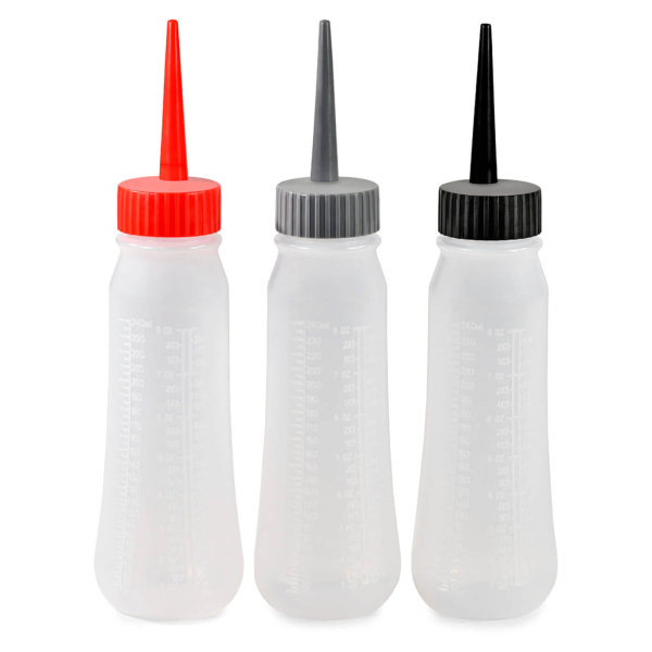 Ergonomic design is easy to squeeze and embossed with measuring scales for precise formulation. Extra-long, narrow tip is ideal for parting hair during precise color application. Durable, washable, and conveniently reusable. Easily identify and track multiple formulas using three 8 oz. bottles with red, silver, and black caps. 3 pk.