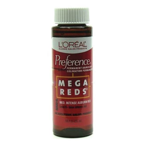 L'Oreal Preference Mega Reds Permanent Haircolor comes in eight vibrant red shades with intense pure red highlights. This hair color features the L'Oreal Anti-Fade Color System that delivers special patented colorant molecules to penetrate the hair cortex and lock in color.