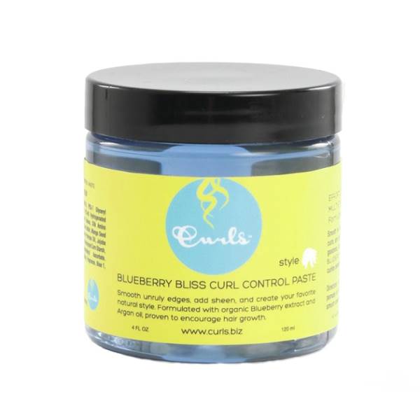 - Mango and shea butter, argan oil, Blueberry Bliss Curl Control Paste smooths and slicks down unruly edges, creating the most luxurious sheen
